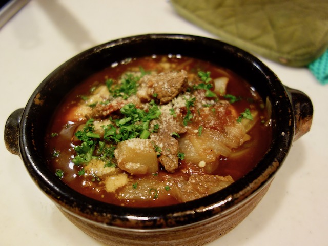 じゅーじゅー。ギネスで煮ると柔らかくなるので、そんなに高いのじゃなくてもいいよ。