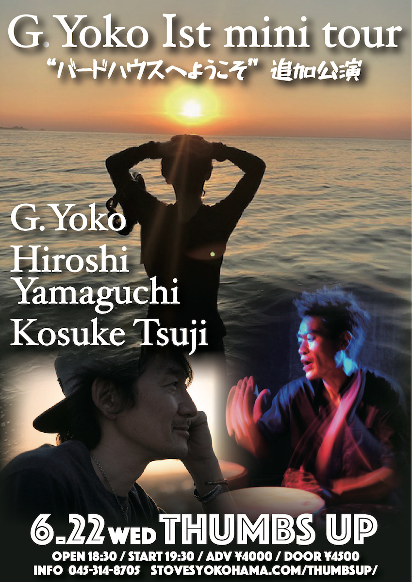 G.Yokoの1st mini tour。どうして関東でやらないんだという声にお応えして、平日ではありますが、急遽、横浜サムズアップで開催することにしました。最終日ということで、スペシャルゲストにパーカッションの辻コースケをお迎えして、スペシャルな感じでお届けします。