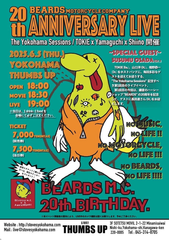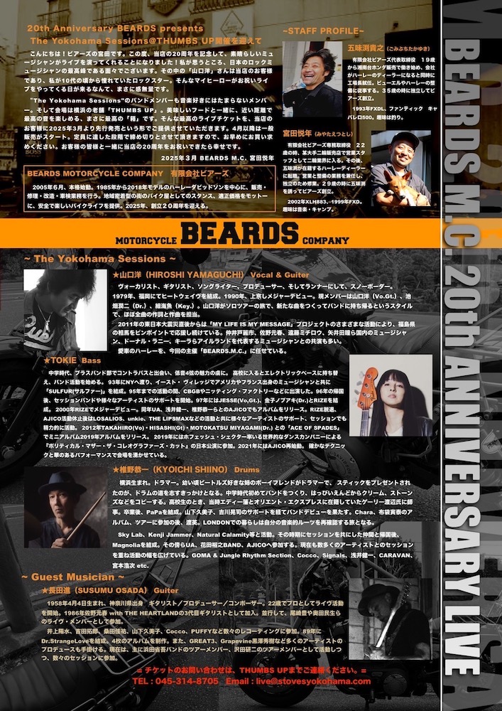 ところで、わたくしコロナを機にハーレーに乗っております。鎌倉にあるBEARDSというハーレー屋さんにいつもお世話になっています。この度、BEARDSが20周年を迎えるにあたって、地元のバイク屋さんがイベントの冠につくという掟破りのコラボレーションを思いつきました。オーディエンスと素晴らしいハコと酒とフード、そしてバイクとロックンロール。垣根を超えて楽しめるイベントになれば、と思っています。