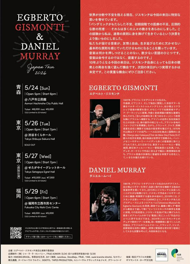 にゃんと!僕らの福岡での延期公演の翌日にエグベルト・ジスモンチさんの福岡公演があるのです。チケットもまだ買える!弱小レーベルのシャチョー(カタカナね)である僕はマネージャーと機材車に乗って、ライヴの翌日フェリーで帰るんです。船が北九州から出るのは23時台。見れるじゃん!